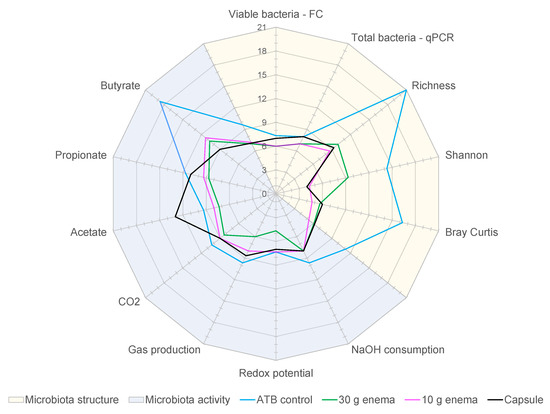 In order to assess FMT efficiency in restoring gut microbiota composition and activity, as well as the influence of mode of administration, the number of “dysbiotic days” was determined. This number of “dysbiotic days” was calculated for each variable listed in Table 2 and for each tested condition (ATB control, 30 g enema, 10 g enema, and capsule). Results were expressed as average of the three replicates (Supplementary Table S1) and represented in Figure 6. These results confirmed that ATB control experiments exhibited the highest number of dysbiotic days with an average of 12.1 days (Supplementary Table S1). FMT treatment clearly decreased dysbiotic periods with a similar value of 7.6 days for both 30 g enema and 10 g enema. For oral capsule, a longer dysbiotic period of 8.3 days was observed (non-significant). When analyzing results in depth especially at microbiota structure and activity levels, different situations were observed depending on FMT mode of administration. Regarding microbial activity, capsule was the less efficient technique with 9.4 days of dysbiosis, followed by 10 g enema (8.7 days), while 30 g enema showed the best score (7.7 days). This difference was mainly due to a high number of dysbiotic days for capsule in relation with acetate production (Figure 6) and probably results from a latent period required for microbial revivification of capsule freeze-dried form. Regarding microbial structure, different ranking was observed, with 30 g enema being the less efficient (7.6 days) followed by capsule (6.9 days) and 10 g enema (6.1 days). The lower efficiency of 30 g enema resulted from a higher number of dysbiotic days in relation with all the microbial diversity indexes.