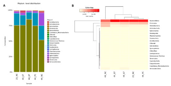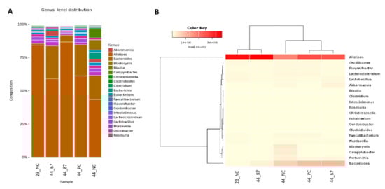 The Bacteroidetes phylum represented the Alistipes and Bacteroides genera (Figure 2). Alistipes slightly increased after 23 days of feeding with the B. subtilis 87Y strain (23_87) FRSM. A drop to 60% of the content of Alistipes was noticeable after feeding with URSM and fermented with the B. subtilis 67 strain, and up to 40% with additional materials being free fed. Significant changes were observed in the genus Bacteroides. From a small initial amount of these bacteria, their content increased to 20% (44_NC) after feeding without additional materials. The addition of strains 67 or 87Y (44_67, 44_87Y) to FRSM resulted in an approximately 25% content of Bacteroides. Only a slight increase of this genus was observed in the URSM sample (44_PC) (Figure 2).