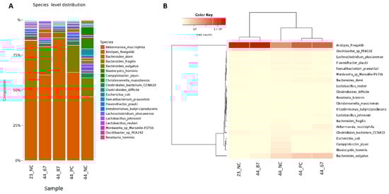 The predominant species in the Alistipes genus was Alistipes finegoldii, and it initially occupied approximately 80% of the population of microorganisms belonging to the Alistipes genus (Figure 3). The addition of strain 87Y to FRSM slightly increased the proportion of A. finegoldii. The addition of strain 67 to URSM and FRSM resulted in a decrease in the content of this species to approximately 60%, while feeding with no additional materials led to a ~45% decrease in the chickens’ cecal content. A decrease in A. finegoldii in samples 44_NC, 44_PC, and 44_67 was associated with a significant increase in Bacteroides vulgatus—occupying only approximately 5% in sample 44_87Y, approximately 15% in 44_NC, and approximately 20% in 44_PC and 44_67. We also observed the Blastocystis hominis (approximately 6%) parasite after feeding with no additional materials (44_NC). This Eukaryote did not develop upon the addition of URSM or FRSM to the feed (samples 44_PC, 44_67, and 44_87Y) (Figure 3).