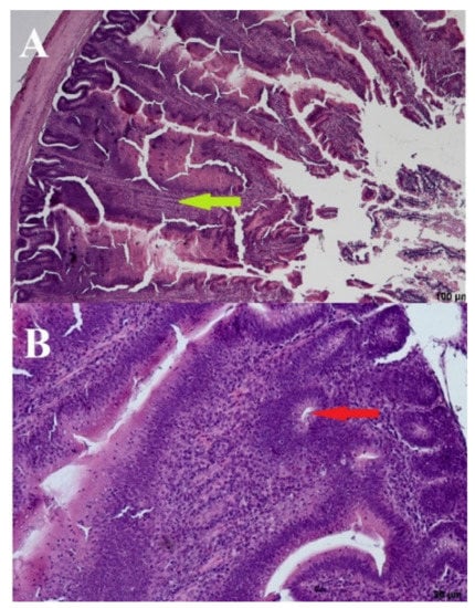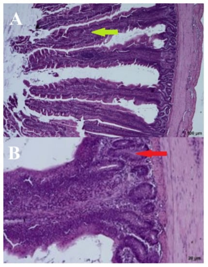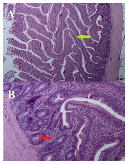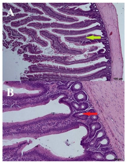 B. subtilis 87Y—(A). Cross section through the intestine—100 µm and (B). crypts—20 µm. Arrows: bold green—villi, red—crypts.