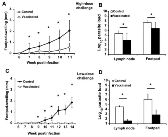 Course of Leishmania amazonensis infection in control and vaccinated mice. BALB/c mice were inoculated with PBS (control) or with 1 × 107 LiΔHSP70-II attenuated promastigotes suspended in PBS (vaccinated) in the right footpad. At week 12 after vaccination control and vaccinated mice were challenged with 5 × 106 ((A,B); high dose, n = 8) or 5 × 104 ((C,D); low dose, n = 5) stationary L. amazonensis promastigotes in the left footpad. In (A) and (C), swelling was calculated weekly and it is given as the difference in thickness between the challenged and the contralateral footpad (mean ± standard deviation (SD)). Parasite burden was individually determined by a limiting dilution assay in the left footpad and the left popliteal lymph node at week 11 (B) or 14 (D) after infectious challenge and it is represented as the mean + SD. * (p < 0.05; Student′s t-test). Results from one out of two similar experiments are represented. No parasites were detected in the liver or the spleen of mice from control or vaccinated groups in any of the experiments.