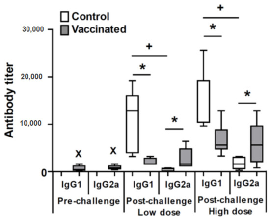 Humoral responses against Leishmania parasites. The reciprocal end-point titers of the IgG1 and IgG2a anti-leishmanial subclasses were analyzed by ELISA 12 weeks after the inoculation of the LiΔHSP70-II attenuated line (pre-challenge; n =13; L. infantum soluble leishmanial antigens (SLA)), 14 weeks after challenge (5 × 104 promastigotes; low dose n = 5) and 11 weeks after challenge (5 × 106 promastigotes; high dose n = 8) with L. amazonensis using SLA of this last species. Data are represented as whisker (min to max) plots and represent one out of two experiments with similar results. X (p < 0.05 statistical differences among titer from the pre-challenge and both post-challenge mice; * (p < 0.05 between titers from control and vaccinated groups); + (p < 0.05 between IgG1 and IgG2a form animals of the control group) analyzed by Kruskal-Wallis test.