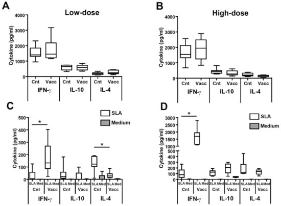 Analyses of the systemic production of cytokines. BALB/c mice were inoculated with PBS (control) or with 1 × 107 LiΔHSP70-II attenuated promastigotes suspended in PBS (vaccinated) in the right footpad. At week 12 after vaccination control and vaccinated mice were challenged with 5 × 104 ((A,C); low dose, n = 5) or 5 × 106 ((B,D); high dose, n = 8) stationary L. amazonensis promastigotes in the left footpad. Animals were sacrificed at week 11 (high dose) or week 14 (low dose) post-challenge and their spleen cells were independently cultured in the presence of ConA (1 µg/mL; (A,B)), L. amazonensis SLA (12 µg/mL) or in medium alone (C,D). The levels of IFN-γ, IL-10, and IL-4 were assessed by ELISA in culture supernatants and are shown as whisker (min to max) plots. * (p < 0.05) shows the statistical differences between control and vaccinated groups (Mann–Whitney test). Results from one out of two similar experiments are represented.