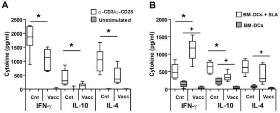 Analyses of the production of cytokines in the lymph node draining the site of L. amazonensis challenge. BALB/c mice were inoculated with PBS (control) or with 1 × 107 LiΔHSP70-II attenuated promastigotes suspended in PBS (vaccinated) in the right footpad. At week 12 after vaccination control and vaccinated mice were challenged with 5 × 106 stationary L. amazonensis promastigotes in the left footpad (n = 8). Animals were sacrificed at week 11 and the left popliteal lymph node cells were cultured in 96-well plates coated with anti-CD3 in complete medium supplemented with anti-CD28. As a control, similar cultures were performed in the absence of stimulating antibodies (A). Equivalent cultures were established and grown with BM-DCs loaded or not with SLA (B). The presence of IFN-γ, IL-10, and IL-4 was determined by ELISA in culture supernatants. Data are shown as whisker (min to max) plots. * (p < 0.05; BM-DCs + SLA) or + (p < 0.051; BM-DCs) shows the statistical differences between control and vaccinated groups (Mann–Whitney test). Results from one out of two similar experiments are represented.
