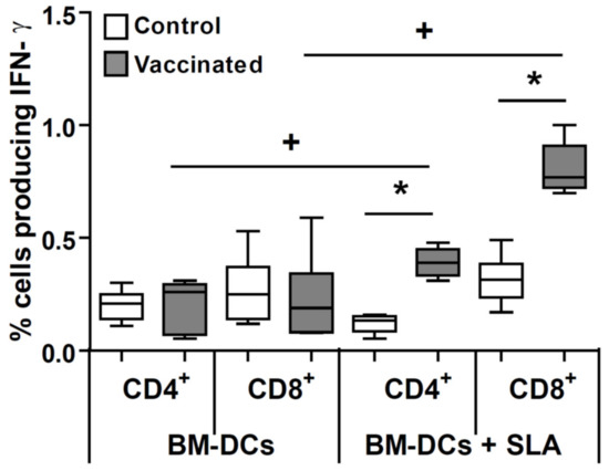 Involvement of T cells in the parasite-dependent production of cytokines. BALB/c mice were inoculated with PBS (control) or with 1 × 107 LiΔHSP70-II attenuated promastigotes suspended in PBS (vaccinated) in the right footpad. At week 12 after vaccination control and vaccinated mice were challenged with 1 × 106 stationary L. amazonensis promastigotes in the left footpad (n = 8). At week 11 after challenge the cells from the left popliteal lymph node were co-cultured with BM-DCs pulsed or not with SLA. Afterwards cells were processed for flow cytometry. The percentages of IFN-γ secreting cells in CD4+ or CD8+ gates are shown. Data are shown as whisker (min to max) plots. * (p < 0.05) shows the statistical differences between control and vaccinated groups; + (p < 0.05) shows the statistical differences between SLA-stimulated and unstimulated cells (Mann–Whitney test). Results from one out of two similar experiments are represented.