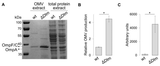 Comparative analysis of OMV production in ΔDlm and ΔdegP background. (A) Western blot analysis of OmpA in OMVs isolated from ULS153 (wt), ULS153 ΔDlm and ULS153 ΔdegP. Blots of SDS-PAGE separations were probed with anti-E. coli OmpA antibody. (B) Relative OmpA abundance determined by densitometry. The OmpA bands of the ΔDlm and ΔdegP strains were normalized to that of the wt. Vertical bars indicate the standard deviation of three independent experiments. Statistical significance was determined by the t test, and p values are as follows: * p < 0.01.