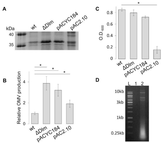 Trans-complementation of the SRRz/Rz1 operon confers a lytic phenotype to ULS153 ∆Dlm. (A) SDS-PAGE separation of OMV proteins from ULS153 (wt), ULS153 ΔDlm), UL153 ∆Dlm carrying the pACY184 vector (∆Dlm pACY184), and UL153 ∆Dlm carrying pAC2.10, a pACYC184-derived plasmid harboring a functional copy of the SRRz/Rz1 operon (∆Dlm pAC2.10). (B) OMV production of ULS153 ΔDlm, ULS153 ∆Dlm pACY184 and ULS153 ∆Dlm pAC2.10 normalized to the ULS153 wt strain. OMV amount was obtained by densitometry of the OmpF/C band in SDS-PAGE separations. (C) Growth measurements (OD600) of ULS153 wt, ULS153 ΔDlm, ULS153 ΔDlm pAC184 and ULS153 ΔDlm pAC2.10 after overnight cultures. Vertical bars indicate the standard deviation of three independent experiments. Statistical significance was determined by the t test, and p values are as follows: * p < 0.01. (D) Agarose gel separation of DNA purified from overnight culture supernatants of ULS153 ∆Dlm pACYC184 (lane 1) and ∆Dlm pAC2.10 (lane 2). The presence of DNA is detectable only in ULS153 ∆Dlm pAC2.10. L, mw markers (kb).