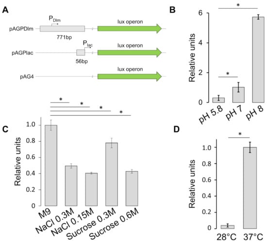 Expression of the DLP12 lysis module in response to stress conditions. (A) Schematic representation of pAGPDlm, pAGPlac and pAG4 constructs. PDlm activity as a function of pH (B), osmolarity (C) and temperature (D). Vertical bars indicate the standard deviation of three independent experiments. Statistical significance was determined by the t test, and p values are as follows: * p < 0.01.