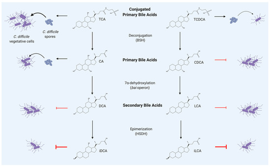 Clostridioides difficile is an anaerobic, spore-forming, toxigenic bacterial pathogen that was first isolated from the stool of newborn infants in 1935 [1]. C. difficile infection (CDI) is the cause of significant morbidity and mortality and is responsible for over 4.8 billion dollars in excess medical costs yearly [2,3]. While the current first line treatment of vancomycin is capable of resolving CDI, 20–30% of patients will experience a recurrence within 30 days. Additionally, 40–60% of patients who experience recurrent CDI once will have multiple recurrences [4,5]. The use of antibiotics, including vancomycin, is a significant risk factor for CDI due to its ability to alter the gut microbiota, resulting in a loss of colonization resistance against C. difficile [6,7,8]. Colonization resistance is defined as the ability of the indigenous gut microbiota to protect against colonization by pathogens such as C. difficile [9]. Understanding the mechanisms of colonization resistance against C. difficile is important for determining the mechanisms by which C. difficile is able to colonize the gut after antibiotics and is important for developing new therapeutics and preventatives for CDI. While there are different mechanisms of colonization resistance, there is evidence that commensal gut bacteria from the genus Clostridium may play a key role, especially those capable of producing secondary bile acids, which are inhibitory to C. difficile [10,11,12,13,14]. In this review, we highlight how commensal Clostridium found in the gut are able to alter colonization resistance against C. difficile, with a particular emphasis on the production of secondary bile acids and other inhibitory metabolites, as well as competition for nutrients.