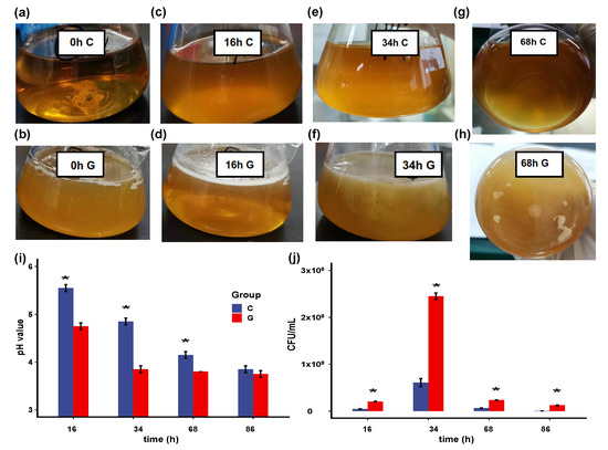 B. longum FGSZY16M3 form biofilm on glass microspheres (GM). Control group at 0 h (a); 16 h (c); 34 h (e); and 68 h (g); GM group at 0 h (b); 16 h (d); 34 h (f) and 68 h (h); (i) pH values of control culture and GM culture. Significance is expressed in comparison with the controls at the same time (* p < 0.05 are significantly different); (j) Cell number of control culture and GM culture.