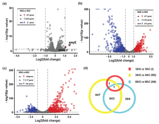 Differentially expressed genes (DEGs) during biofilm formation. (a) The volcano plot of S1 showing the upregulated (red points) and downregulated (green points) DEGs between 16 hG and 16 hC. G, the culture group in the presence of GM. C, the control group without GM; (b) The volcano plot of S2 showing the DEGs between 34 hG and 34 hC; (c) The volcano plot of S3 showing the DEGs between 68 hG and 68 hC; (d) Venn diagram representation of the number of DEGs during biofilm formation.