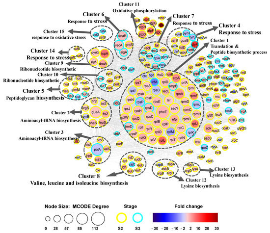 Biofilm formation protein–protein interaction (PPI) network. 15 distinct functional clusters were detected in DEGs during biofilm formation. Each cluster is a set of highly-connected nodes and is illustrated in a circle. The size of the node was determined by MCODE degree. Yellow was S2, and turquoise was S3. Fold change was represented with red and blue color shade. Red was upregulated, and blue was downregulated.