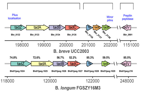 Schematic representation of the tad locus from B. longum FGSZY16M3. Each arrow represents an open reading frame with the gene number given above the arrow and the gene name given within the arrow. The functions of the encoded proteins are indicated below the arrow. The levels of amino acid identity compared with B. breve UCC2003 (expressed as percentages) are indicated.