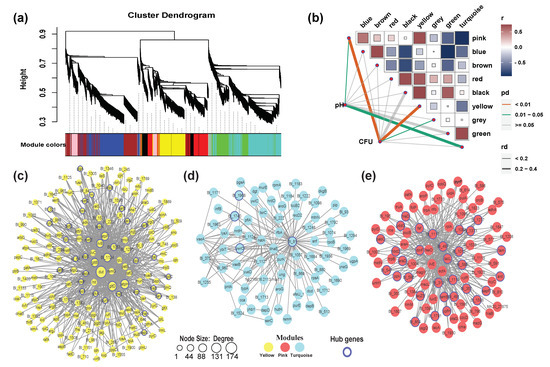 Weighted gene co-expression network analysis (WGCNA) of expressed genes. (a) Hierarchical cluster tree showing nine modules of co-expressed genes. Each of the 2032 genes is represented by a leaf in the tree, and each of the nine modules by a major tree branch. The lower panel shows modules in designated colors, such as ‘Blue’, ‘Pink’, ‘Turquoise’ and others. Note that module ‘Grey’ is for unassigned genes; (b) Module-colony-forming units (CFU)/pH correlations and corresponding P-values. Co-expression network analysis of yellow (c); turquoise (d); and pink (e) modules. The size of the node circle is positively correlated with the number of interacting gene partners. The genes marked in blue present the hub genes of each module.