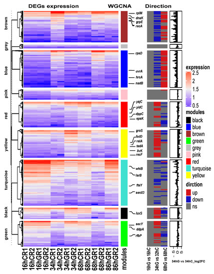 After PPI network analysis, genes in terms of SOS response and EPS production, response to stress, regulation of gene expression, QS, two-component system may be involved in biofilm formation process. Genes with similar expression patterns may have similar functions. It is possible to predict whether a new gene is also involved in the biofilm process using the known genes involved in biofilm formation. The fragments per kilobase of exon per million mapped fragments (FPKM) was used to conduct the hierarchical clustering analysis of transcript abundance, and 2032 genes were divided into nine clusters based on the WGCNA modules (Figure 6). The upregulated DEGs in the S2 stage were mostly in yellow, green, black, and red modules, and the upregulated DEGs in S3 stage were brown and blue, whereas the downregulated DEGs in S2 and S3 were related to the turquoise module. The genes in the pink and gray modules were not differentially expressed genes, and the expression levels were low in each sample. To further identify genes involved in biofilm formation, relevant WGCNA modules were selected for functional analysis. There were 6, 18, 12, 15, 26, 19, and 37 genes associated with response to stress, regulation of gene expression, QS, and two-component system identified in black, blue, brown, green, red, yellow, and turquoise, respectively.