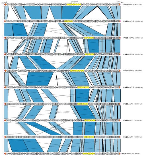 3.6. crpP-Carrying Pathogenicity Genomic Islands (PAGI)