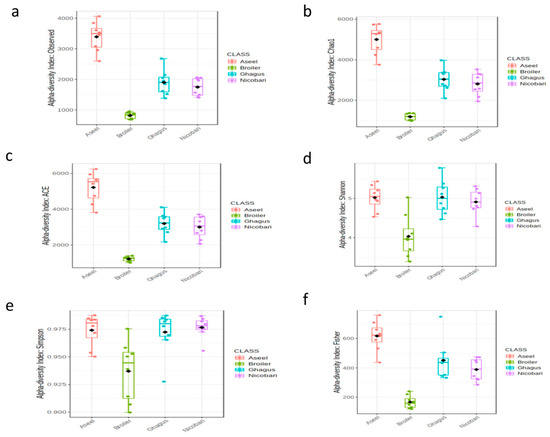 Alpha diversity across samples. Sequences were rarified to the minimum library size (at 12,151 sequences per sample). Differences in alpha diversity metrics of microbial diversity and richness in the gut microbiota of chickens of different breeds or lines are shown as boxplots. (a) the observed number of OTUs, (b) Chao1, (c) abundance based coverage estimator (ACE), (d) Shannon, (e), Simpson, (f) Fisher.