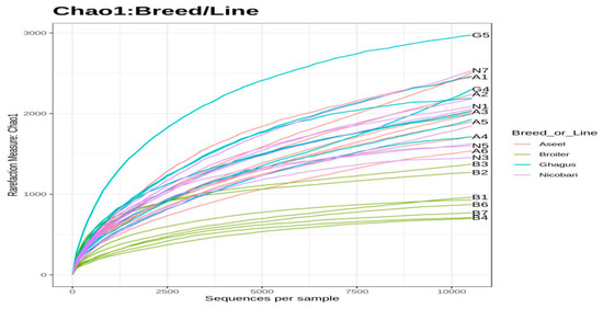Besides richness and diversity estimators, rarefaction curves based on the Chao1 index were also plotted. The rarefaction curve depicts the correlation between the number of sequences and the number of OTUs and the steeper the slope, the higher the diversity [31]. The rarefaction curve also indicated that the broiler line had lower diversity than those of the indigenous breeds (Figure 2). Rarefaction curve approached the asymptotic level for each breed or line, suggesting the availability of sufficient reads to represent each microbial community.