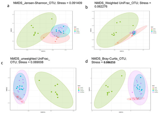 Beta diversity plots visualized using ordination methods NMDS at the phylum level using NMDS method of ordination have been presented in Figure S3. Jaccard index resulted in similar plots in NMDS scaling as that of Bray–Curtis distance both at phylotype-out, as well as at Phylum Level and, hence, plots for the Jaccard index have not been presented.