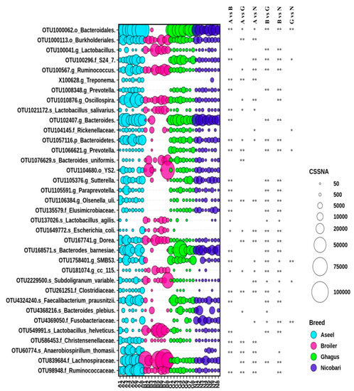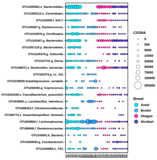 Breed or line-specific and across-breed or line core phylotype-OTUs. Phylotype-OTUs with a mean normalized (cumulative sum scaling) relative abundance of at least 0.1% and having within breed or prevalence of at least 50% in at least one breed were taken into account The size of bubbles in the bubble plot indicates normalized (cumulative sum scaling) abundance of each OTU.