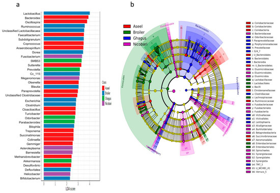 A cladogram of important biomarkers identified at different taxonomic levels in different breeds/lines using LefSe with LDA scores >3.5 has been presented in Figure 6b. The class Coriobacteriia, orders, such as unclassified Bacteroidetes and Aeromonadales, families, such as Christensenellaceae, Ruminococcaceae, and Succinovibrionaceae, were major biomarkers in the Aseel. The phylum Firmicutes, class Bacilli, order Enterobacteriales, and families, such as Lactobacillaceae and Enterobacteriaceae, were top biomarkers in the broiler line. The phylum Bacteroidetes, classes TM7_3, Bacteroidia, and Lentisphaeria, orders, such as Bacteroidales, and families, such as Odoribacteraceae, Paraprevotellaceae, Porphyromonadaceae, Prevotellaceae, S24_7, Clostridiaceae, and Victivallaceae were top biomarkers in Ghagus. The phylum Elusimicrobia and Synergistetes, classes Fusobacteria, Elusimicrobia, Synergistia, Verruco_5, Epsilonproteobacteria, Betaproteobacteria and Pedosphaerae, orders, such as Elusimicrobiales, Fusobacteriales, Burkholderiales, and families, such as Bacteroidaceae, Elusimicrobiaceae, Fusobacteriaceae, Alcaligenaceae, and Synergistaceae were top biomarkers in Nicobari.