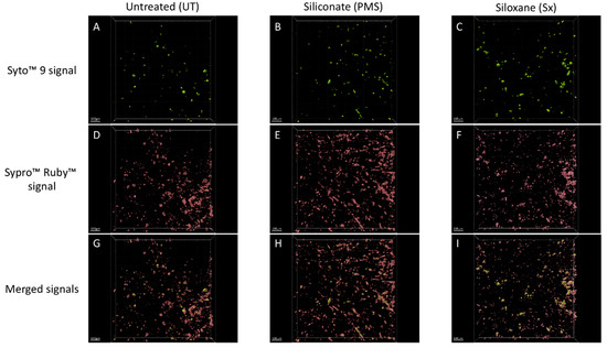 Thus, confocal macroscopy observations provided interesting data that characterized the multispecies biofilm matrix features. On all types of tiles, this matrix appeared thick and well-developed. The average biovolumes of the matrices were 1851.5 ± 916.8 µm3 for UT, 1624.8 ± 546.1 µm3 for PMS, and 5280.8 ± 8979.3 µm3 for Sx. The biomasses of the matrices were, on average, 443.2 ± 219.5 µm3·µm−2 for UT, 389.0 ± 130.7 µm3·µm−2 for PMS, and 1264.1 ± 2150.0 µm3·µm−2 for Sx. The mean thicknesses of the biofilms were 26.1 ± 7.0 µm for UT, 22.0 ± 1.4 µm for PMS, and 24.7 ± 4.0 µm for Sx. The maximal thicknesses of the biofilms were 91.8 ± 31.8 µm for UT, 103.5 ± 20.1 µm for PMS, and 111.6 ± 23.5 µm for Sx (Table 2). Nevertheless, no significant difference among matrix thicknesses was found by comparing the different types of tiles (Wilcox test, p-value > 0.5, Table 2).