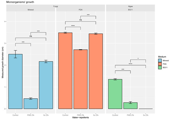 Fungal growth (Cladosporium cladosporioides) on mineral medium and PDA after 28 days with commercially used water-repellent concentrations (PMS 2%, and Sx 2%) and without water-repellent addition as the negative control. Algal (Stichococcus bacillaris) growth on BG11 after 28 days with commercially used concentrations of water repellents (PMS 2%, and Sx 2%) and without water-repellent addition as the negative control. ns: non-significative, * 0.05 ≥ p value > 0.01, ** 0.01 ≥ p value > 0.001, *** 0.001 ≥ p value > 0.0001, **** 0.0001 ≥ p value.