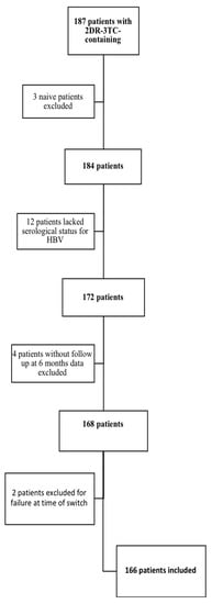 As shown in Figure 1, of the 187 patients followed in the multicenter cohort, three patients were excluded because they started the 2DR-3TC regimen as naïve, twelve patients were excluded due to a lack of HBV serological data, two patients were excluded because they were in virologic failure at the time of the switch, and four patients were excluded because their virological data were missing at 6 and 12 months after the switch. Ultimately, 166 patients were studied.