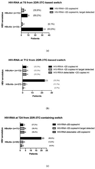Comparison of HIV-RNA undetectability after the 2DR-3TC switch in the HBcAb-positive and HBcAb-negative groups, after 6 months (a) T6, n = 46, 12 months, (b) T12, n = 39, and 24 months (c) T24, n = 36, and overall comparison of patients subgroup characteristics.