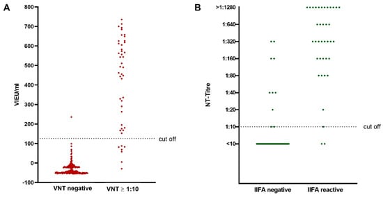 Distribution of (A) Vienna units (VIEU)/mL determined by ELISA within negative and positive neutralization test (NT) results and (B) of NT-titers within negative and positive IIFA results.