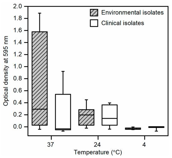 Initial screening and optimization of the two-component apparatus using bacterial cultures standardized to 8 log CFU/mL revealed biofilm formation in all environmental isolates and clinical isolate 111 at temperatures of 24 °C and 37 °C but not at 4 °C (Figure 3). No biofilm formation was detected from clinical isolates 128 and 8354 at all incubation temperatures. At an incubation temperature of 37 °C, environmental isolates showed increased biofilm formation compared to clinical isolates whereas at 24 °C, biofilm formation in both groups were similar. No statistical differences in biofilm formation were observed between environmental and clinical isolates at all incubation temperatures.
