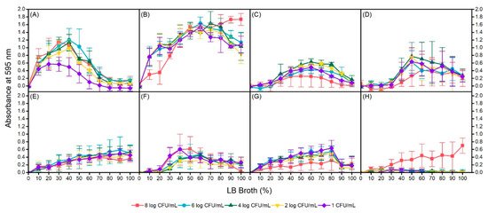 To determine the optimal biofilm formation conditions for each isolate, manipulation of inoculum size and nutrient concentration was incorporated through serial dilutions of each variable. Again, similar observations of no biofilm formation were obtained at 4 °C for all isolates regardless of inoculum size and nutrient concentration. For the 4 isolates that were capable of forming biofilms at 24 °C and 37 °C, conditions yielding maximum biofilm formation were not identical within isolates at different incubation temperatures or between isolates at the same temperatures (Figure 4). Among the isolates, environmental isolate AW1.7 formed the most biofilm at 24 °C and 37 °C temperatures as measured by absorbance of crystal violet at 595 nm. In addition, biofilm formation of AW1.7 was evidently different between the two temperatures, with maximum formation in 40% LB broth and 6 log CFU/mL inoculum, and 100% LB broth and 8 log CFU/mL inoculum at 24 °C and 37 °C, respectively. Environmental isolate 53 was capable of forming biofilms at 24 °C in concentrations of 30% to 90% LB broth at all cell concentrations with the exception of 8 log CFU/mL and maximum formation was observed at 60% LB broth and 4 log CFU/mL. Biofilm formation in isolate 53 was interestingly quite different at 37 °C, with maximum formation at 50% LB broth for most cell concentrations. Furthermore, biofilm formation at this temperature was undetectable or weak until a nutrient concentration of 40% LB broth was reached. Isolate 63, also of environmental origin, was capable of forming biofilms at both 24 °C and 37 °C. At 24 °C, biofilm formation was linear, with maximum formation observed at 90% and 100% LB broth at all cell concentrations. Similar to isolate 53, at 37 °C, isolate 63 was capable of forming biofilms only in specific conditions; LB broth concentrations of 0% to 20% did not support biofilm formation at any inoculum sizes. Optimal conditions for maximum biofilm formation in isolate 63 at 37 °C were observed at 40% LB broth and 1 log CFU/mL, and 50% LB broth and 8 log CFU/mL. Of the 3 clinical, heat resistant isolates, only isolate 111 was a biofilm former. Isolate 111 formed biofilms at all inoculum sizes at 24 °C incubation but maximum formation was observed only up to 80% LB broth. In addition, biofilm formation was substantially lower at an inoculum size of 8 log CFU/mL regardless of LB broth concentration compared to the other dilutions. Interestingly, at 37 °C, only an inoculum of 8 log CFU/mL of isolate 111 had biofilm formation. All other cell dilutions of isolate 111 were unable to form any biofilm across all LB broth concentrations. Upon regression analysis, statistically significant interactions between temperature and nutrient concentration were observed for isolates AW1.7, 53, and 63; no interaction was detected for clinical isolate 111 (Table 2). In isolate 63, increasing the bacterial inoculum was not significantly associated with absorbance of crystal violet (p = 0.791, 95% CI: (−0.006, 0.007)). However, in isolates AW1.7 and 111, an increasing bacterial inoculum was associated with an increase in mean absorbance whereas in isolate 53, a decrease in mean absorbance was detected.
