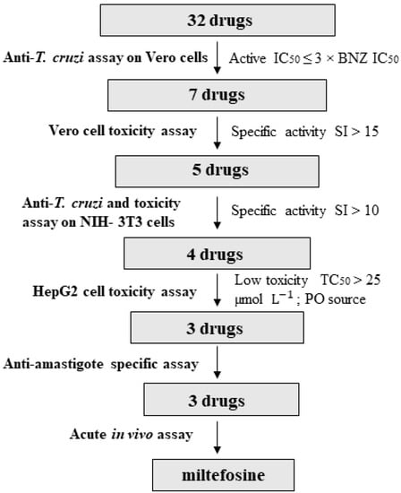 - De Rycker, M.; Thomas, J.; Riley, J.; Brough, S.J.; Miles, T.J.; Gray, D.W. Identification of trypanocidal activity for known clinical compounds using a new Trypanosoma cruzi hit-discovery screening cascade. PLoS Negl. Trop. Dis. 2016, 10, e0004584. [Google Scholar] [CrossRef]