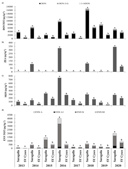 ZEA was detected in 2014, 2016, 2018 and 2019, albeit only in Saragolla, and in both Saragolla and SY Cysco in 2020 (Figure 1). The ZEA contamination in Saragolla was on average 178 µg kg−1 in the aforementioned growing seasons. In these years, ANOVA showed a significantly lower ZEA content in SY Cysco than in Saragolla, except in 2019. No difference was recorded between SY Cysco and Secolo, Odisseo and Secolo in these years (Figure 2).