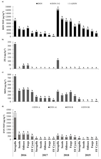 In 2016, and considering the most susceptible cv Saragolla, the MON and ENNS were 747 and 4014 µg kg−1, respectively.