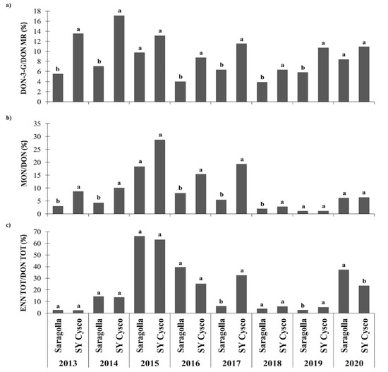 Effects of the growing season and durum wheat cultivar with different degrees of FHB susceptibility on the mycotoxin content ratios in NW Italy during the 2012–2020 period: (a) Deoxynivalenol-3-glucoside/deoxynivalenol molar ratio (DON-3-G/DON MR); (b) Moniliformin/Deoxynivalenol content ratio (MON/DON); (c) Total enniatin/Total deoxynivalenol content ratio (ENN TOT/DON TOT: ENN TOT = sum of enniatin A, ENN A; enniatin A1, ENN A1; enniatin B, ENN B; and enniatin B1, ENN B1; DON TOT = sum of deoxynivalenol, DON; deoxynivalenol-3-glucoside, DON-3-G; and 3-acetyldeoxynivalenol, 3-ADON). Different letters above the bars indicate significant differences between cultivars for each growing season (p < 0.05). The reported data are the average of 3 replications.