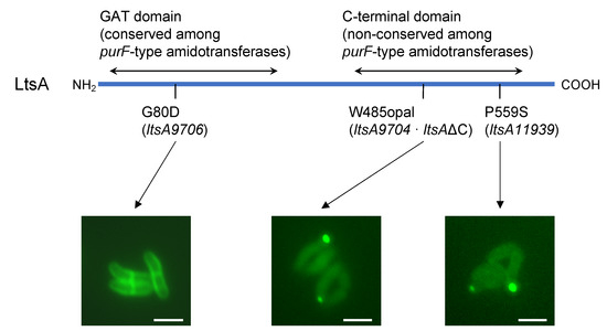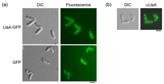 2.3. Construction of GFP-Fused ltsA Genes and Microscopic Observation of Intracellular Localization of LtsA-GFP Fusion