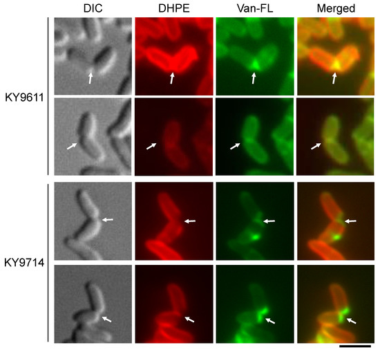 We then examined the effect of the ltsA mutation on the formation of cell surface structures by differential staining with fluorescent dyes. As reported previously, the mycolic acid-containing layer can be visualized by staining with phospholipid analog DHPE labeled with fluorescent dyes, while the peptidoglycan layer can be visualized by staining with Van-FL [26]. As shown in Figure 3, the wild-type cells were uniformly covered with a mycolic acid-containing layer. On the other hand, the ltsA mutant strain KY9714 had a defect in part of the mycolic acid-containing layer. In addition, the mycolic acid-containing layer at the nascent division plane in the dividing cells disappeared in the ltsA mutant cells. Instead, the peptidoglycan layer was exposed to the extracellular environment.