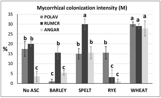 Mycorrhizal colonization intensity (M, in %) of Polygonum aviculare (POLAV), Rumex crispus (RUMCR) and Anagallis arvensis (ANGAR) in No ASC (control) and Yes ASC (barley, spelt, rye and wheat) systems, sampled at melon harvest (August 2014). Different letters represent significant differences (Tukey’s HSD test for means comparison).