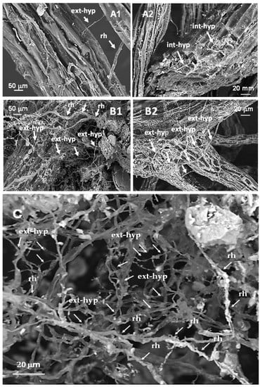 To verify the presence of AMF extra-hyphal (hyp) mycelium development on melon and orange tree roots, selected fresh root fragments were observed at increasing magnifications by Scanning Electron Microscopy (Microscope EVO MA10—Zeiss) under variable pressure, equipped with a LaB6 electron sources by using the back-scattered electrons detector (SEM-BSE). The applied variable pressure mode (at 20–25 kV EHT/10 Pa chamber pressure) prevented surface damage of such biological and non-conductive samples, giving a high-resolution image without any sample pretreatment [].