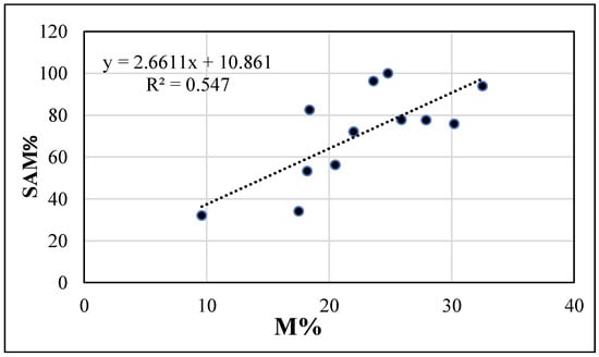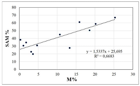In April, no correlations were found between melon mycorrhization and % mycorrhizal weeds (−0.2684), species Richness (0.2207) or Shannon–Weaver index (−0.3573). On the contrary, at melon harvest, both the % mycorrhizal weeds and the species Richness were highly correlated with the melon mycorrhizal colonization (0.7396 and 0.7945, respectively), corresponding to a positive linear regression between M% and SAM% (R2 = 0.547, Figure 3). A good correlation was also found between cash crop mycorrhization and Shannon–Weaver index (0.6688). Among the considered mycorrhizal weeds in the field, the POLAV was the most correlated with melon mycorrhization (0.8041), while ANGAR (0.4644) and RUMCRI (0.1593) were poorly correlated.