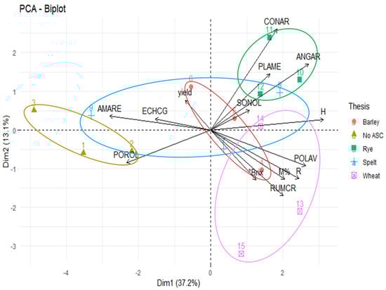 The first component completely separated the tilled No ASC control from the no tilled rye and wheat systems, and only partially from the spelt and barley ones. Along the positive values of C1, the no-till ASC systems were associated with the following species: Polygonum aviculare L. (POLAV), Anagallis arvensis L. (ANGAR), Rumex crispus L. (RUMCR) and Convolvulus arvensis L. (CONAR), and, secondarily, with Plantago media L. (PLAME) and Sonchus oleraceus L. (SONOL). These species positively contributed to the global diversity of the sample (H and R diversity indices). Moreover, the ensemble sustains melon mycorrhization and Brix. The species Amaranthus retroflexus L. (AMARE) and Portulaca oleracea L. (POROL) and, secondarily, Echinocloa cruss-galli L. (ECHCG) were correlated with No ASC and uncorrelated with Shannon–Weaver index, species Richness and melon mycorrhization. The melon yield was not correlated with either variables’ groups.
