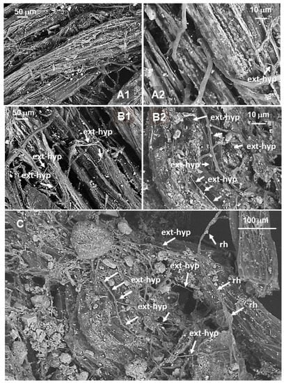 An abundant mycelial network surrounding melon roots was observed in the wheat system (Figure 2B1), and it was better highlighted at the highest magnitude (Figure 2B2,C, Video S1). The same mycelial network was poorly developed in the control system, where ASCs were not introduced (Figure 2A1,A2).