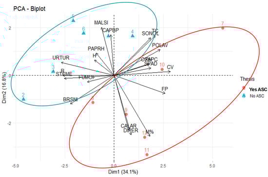 PCA biplot and confidence ellipses ordering the organic orange tree experimental trial relative to main weed species cover (%), frequency (%) of Polygonum aviculare (POLAV), Calendula arvensis (Vaill.) (CALAR), Diplotaxis erucoides (DIPER), Brassica nigra (BRNSI), Stellaria media (STEME), Urtica urens L. (URTUR) and Malva sylvestris L. (MALSI), Shannon–Weaver index (H), specie Richness (R), orange root mycorrhizal colonization intensity (M%), foliar SPAD and P content (FP, g kg−1), plant height (PH), trunk circumference (TC) and canopy volume (CV) at the April sampling time. No ASC: fallow. Yes ASC: barley.