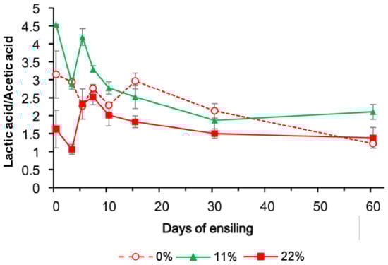 The addition of 22% OS enhanced heterolactic acid fermentation, as observed by the lowest lactic acid/acetic acid ratio in samples before day 60. When 22% OS was added into TMR, heterolactic acid fermentation became even more frequent [23]. Homofermentative LAB ensure the rapid and efficient production of lactic acid, and the pH decreases rapidly [24], while heterolactic acid fermentation allows the aerobic stability to improve [25]. Moreover, as the concentration of butyric acid, an undesirable clostridial fermentation product that could generate a loss in DM and a reduction of feed intake [26], was lower in FTMR with more oat silage. This finding further supports the idea that adding oat silage could improve the fermentation quality.