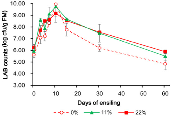 Changes in the lactic acid bacteria (LAB) count in FTMR during fermentation for different OS concentrations. FM, fresh matter. 0%, 0% oat silage; 11%, 11% oat silage; 22%, 22% oat silage. Data were analyzed by two-way ANOVA.