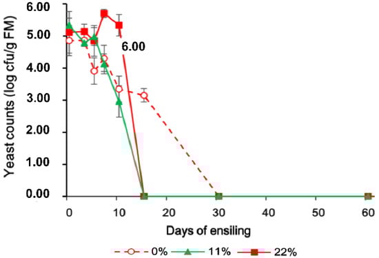 Changes in the yeast count in FTMR during fermentation for different OS concentrations. 0%, 0% oat silage; 11%, 11% oat silage; 22%, 22% oat silage. Data were analyzed by two-way ANOVA.