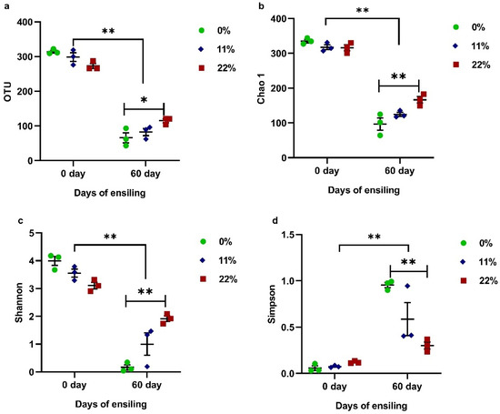 Effect of the OS content on Operational Units (OTUs) (a), Chao 1 (b), and the Shannon (c) and Simpson (d) indexes in FTMR before and after 60 days of fermentation. 0, 0% oat silage; 11, 11% oat silage; 22%, 22, oat silage. Data were analyzed by two-way ANOVA. * indicates p < 0.05; ** indicates p < 0.01.