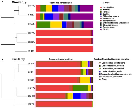 Bacterial community structure of three types of FTMR before and after 60 days of ensiling. Bacterial taxonomy at the genus level (a) and species taxonomy of the Lactobacillus genus complex (b). 0 d 0%, 0% oat silage on day 0; 0 d 11%, 11% oat silage on day 0; 0 d 22%, 22% oat silage on day 0. 60 d 0%, 0% oat silage on day 60; 60 d 11%, 11% oat silage on day 60; 60 d 22%, 22% oat silage on day 60.