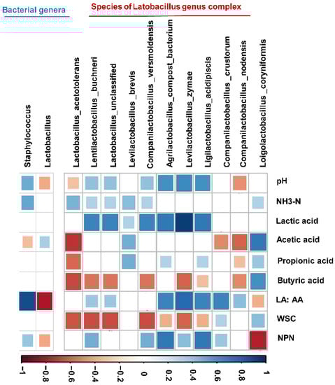 Considering the relationship between the bacteria and the fermentation products of the FTMR, Spearman correlations with an absolute correlation coefficient higher than 0.3 at both the genus and species levels were investigated. The lactic acid/acetic acid ratio showed a negative correlation with the Lactobacillus genus complex and a positive correlation with the Staphylococcus genus (Figure 6). At the species level, we found that the lactic acid and NH3–N concentrations were positively corelated with the occurrence of species from the Lactobacillus genus complex. The NPN content was positively correlated with the presence of Ligilactobacillus acidipiscis and Lactobacillus uncultured compost bacteria and positively corelated with Loigolactobacillus coryniformis.